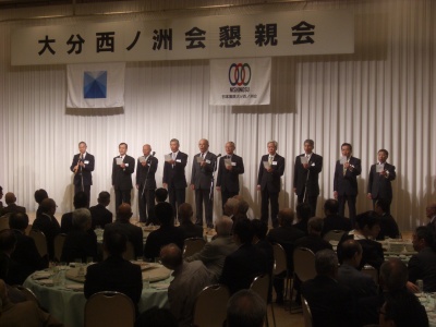 | 西ノ洲会創立40周年記念行事の一環として、総会、講演会終了後、懇親会が盛大に開催されました。懇親会には大分製鉄所から野見山所長はじめ幹部の方々、労働組合から松尾組合長はじめ三役の出席を戴き、来賓者79名、会員199名、総勢278名の皆様が出席され、三重野副会長の司会のもと進行されました。 主催者の高橋会長よりの挨拶、来賓の野見山所長、松尾組合長の挨拶と続き、大石市議会議員の紹介の後、会員有志による「祝詩吟」が披露され、大分製鉄所川村副所長の乾杯で開宴となりました。歓談中には「大分製鉄所吹奏楽部」の演奏や、会員有志による「ひょっとこ踊り」が披露され懇親会を盛り上げて頂きました。 会員と現役幹部の皆様が各職場毎に配置したテーブル毎で旧交を温め、近況を語り合う姿が見られました。懇親会は開田副会長の万歳三唱で締め括られました。 |