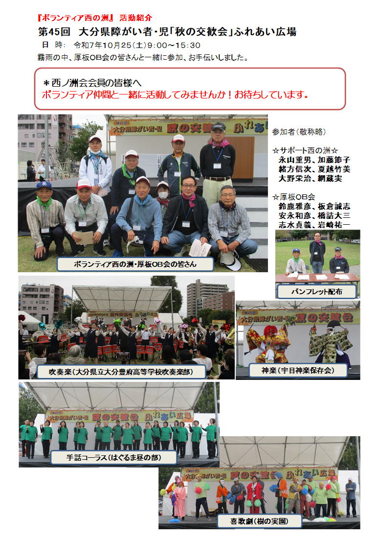 | 大分市超ふくし祭り | R6.10/7.ホルトホール開催、ボランティア西の洲会活動紹介ポスター出展。 | |||||||||||||||||||||||||||||||||||||