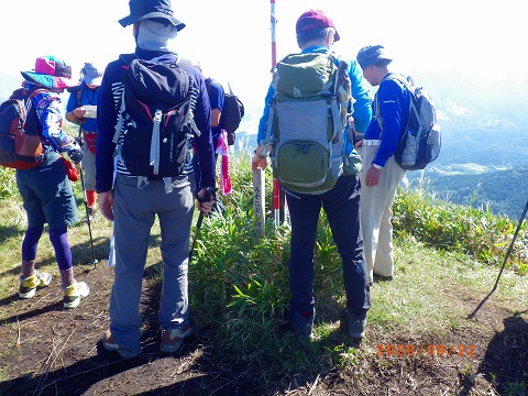| (9) 女岳頂上です。正面が涌蓋山です。 | (10) 予定通り、昼前に涌蓋山到着です。絶景をながめながらの昼食です。 | |