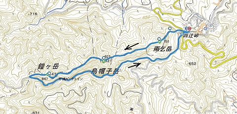 | (1) 地形図 四辻峠を出発し、尾根を雨乞岳~烏帽子岳~鎧ケ岳へと縦走し、帰路は平成パークラインを下ります。クリックで拡大 | (2) 四辻峠からキツイ登りが始まります。10時07分出発です。「立入禁止」の看板には「解除中」の標識が取り付けられていました。 | |