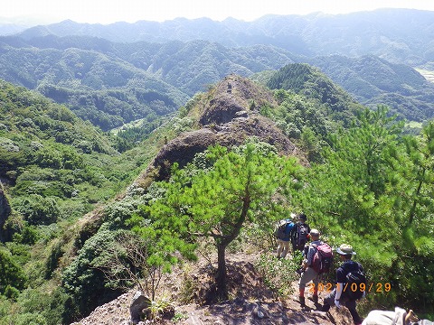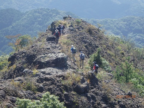 | (11) 東尾根です。岩尾根を歩きます。 | (12) 皆、慎重です。クリックで拡大 | |