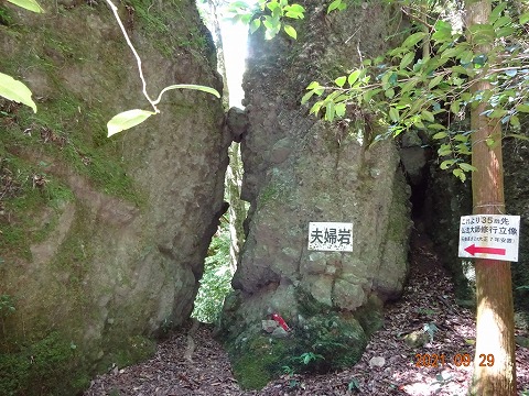 | (5) 身体の大きな人は無理?。 | (6) 夫婦岩をくぐると、弘法大師立像が祀られています。引き返し再び渓谷を登って行きます。ロープ場もあります。 | |