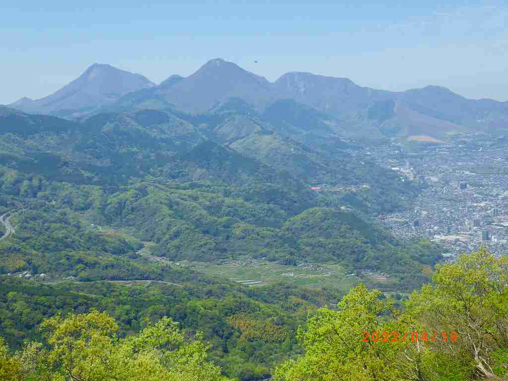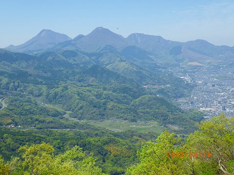 | (13)眼下にうみたまご(水族館)が見えます。遠くに大分市街地も薄っすらと見えます。クリックで拡大 | (14) 圧巻です。由布・鶴見方面です。クリックで拡大 | |