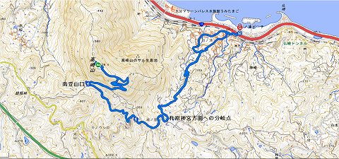 | (1) 地形図 クリックで拡大 国土地理院の地図を利用したYAMAP(地形図)からコピーし、地図の一部に書き込みをしたものです。 | (2) 田ノ浦ビーチの海抜ゼロメートルから出発です。 | |