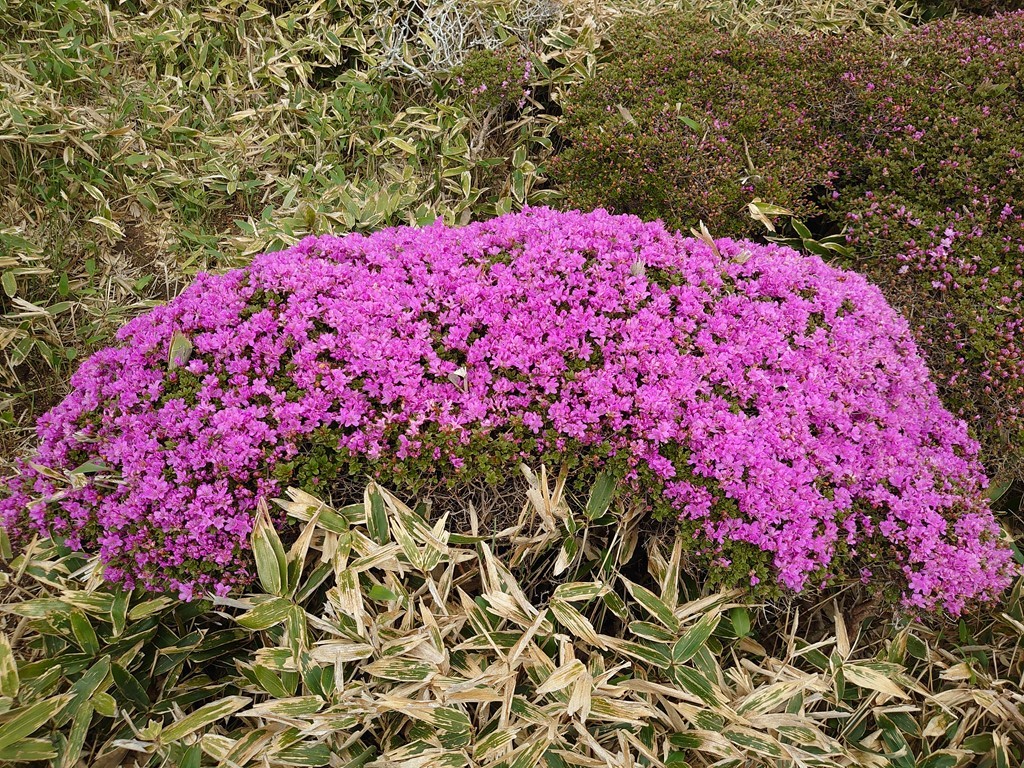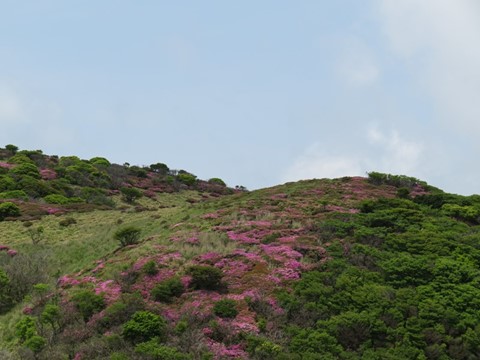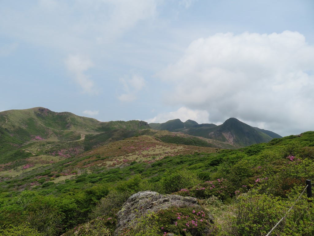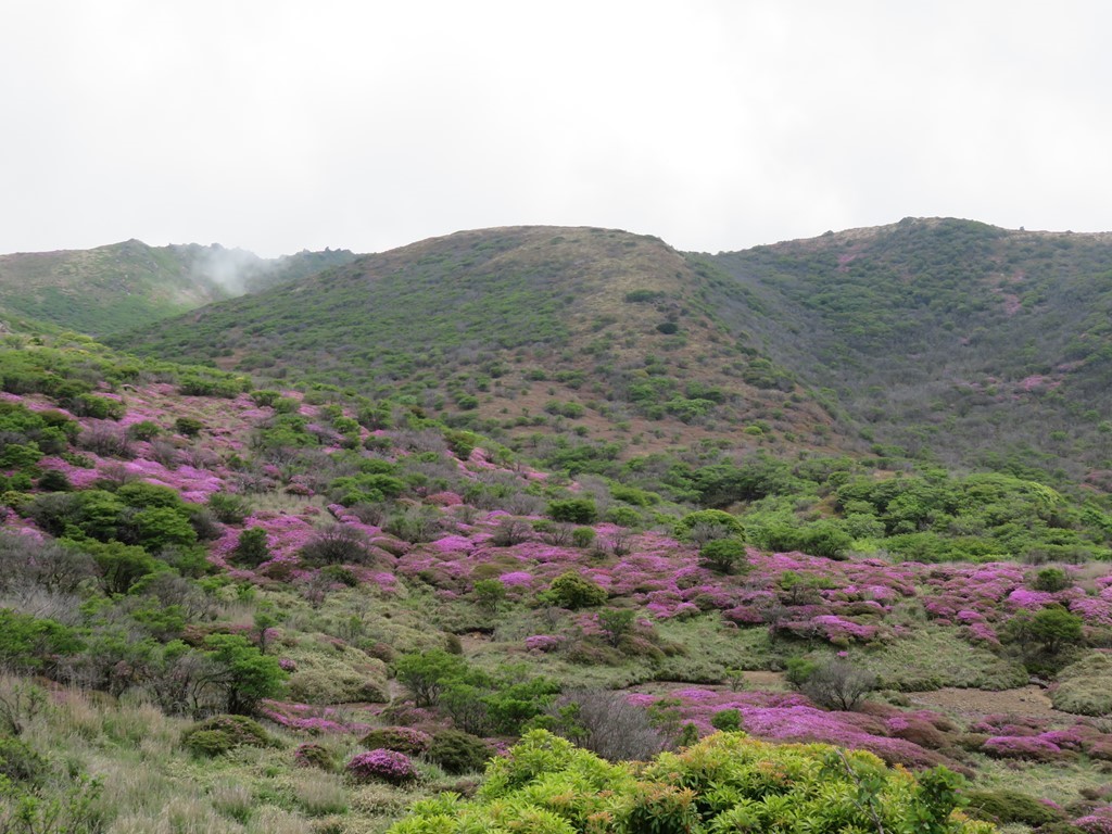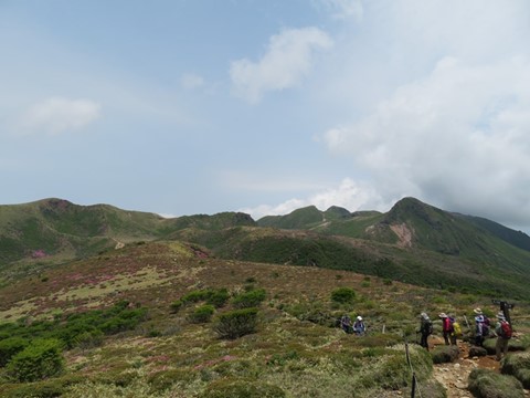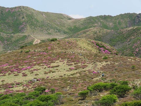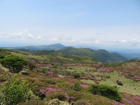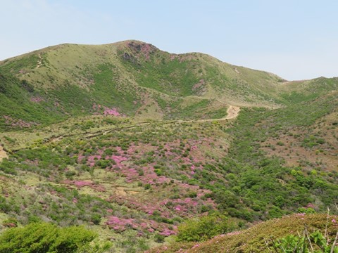 (14) 下山中、星生山方面、所々にミヤマキリシマのピンクが クリックで拡大 |