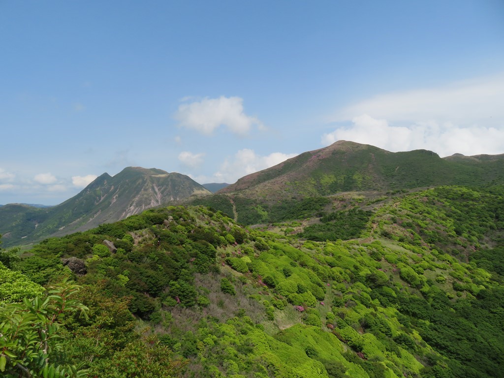 (10) 扇ガ鼻の頂上からくじゅう連山を望む。 尖ったピーク、 右から久住山、中岳、天狗が城、左端が星生山 |