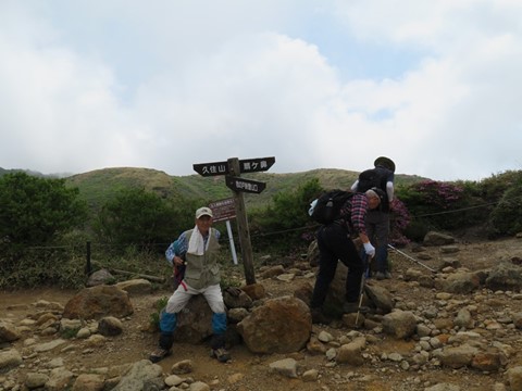 | (5) 登山道から、ミヤマキリシマのピンクに疲れも癒されます | (6) 久住山方面と扇ガ鼻分岐点到着。右側の扇ガ鼻へ向かいます | |