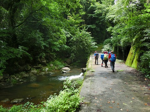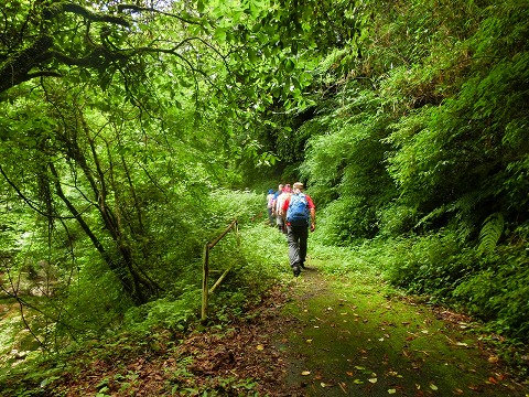 | (3) 県民の森管理事務所から、舗装道路を少し戻り、ガードレール先端をUターン気味に右折します。 | (4) セラピーロードを行きます(旧サイクリングロード)。緑が多くて気持ちいいです。 | |