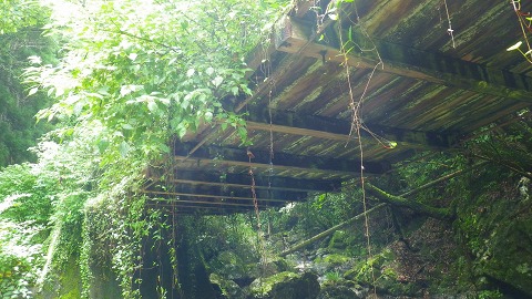 | (9) 橋の右上に、古いつり橋があります。下から撮りました。 | (10) 今にもこけ落ちそうです。勿論通行禁止です。 | |