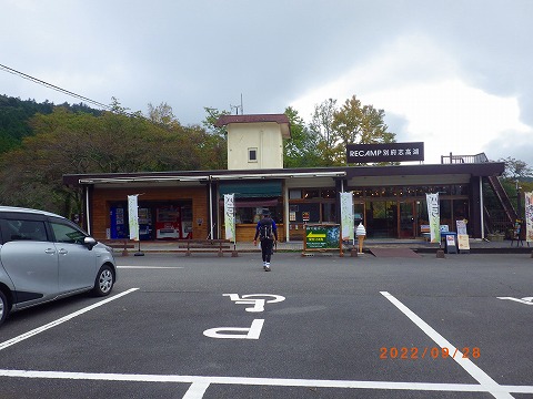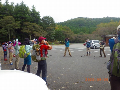 | (1) 管理事務所前に駐車させて頂きました。キャンプ受付、売店等あります。 | (2) 先ずは全員で身体をほぐしました。 | ||