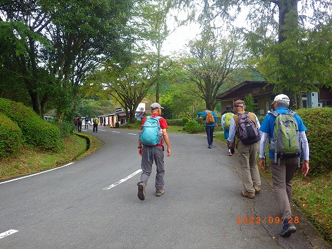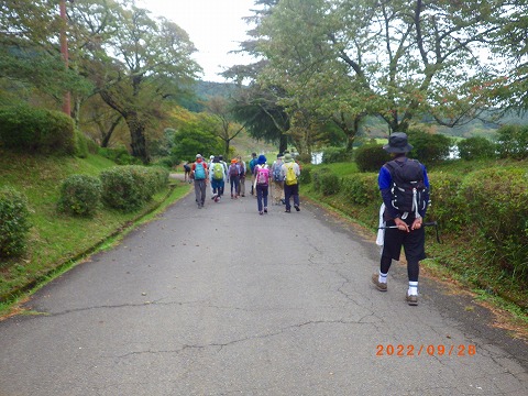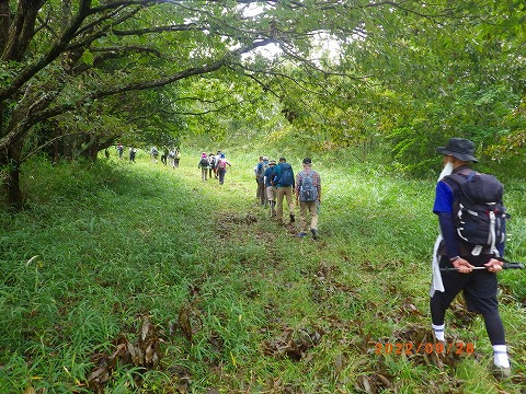 | 当初東山ハイキングコースの予定でしたが、先日の台風でコース内の丸木橋が流出し、通行不可の情報が入り急遽「小鹿山」に変更しました。登山道は整備されており歩きやすいですが、最後の急坂は皆汗をかきながら登りました。山頂はガスがかかり残念ながら展望は得られませんでした。秋の訪れを感じながらの楽しい山歩きとなりました。 |