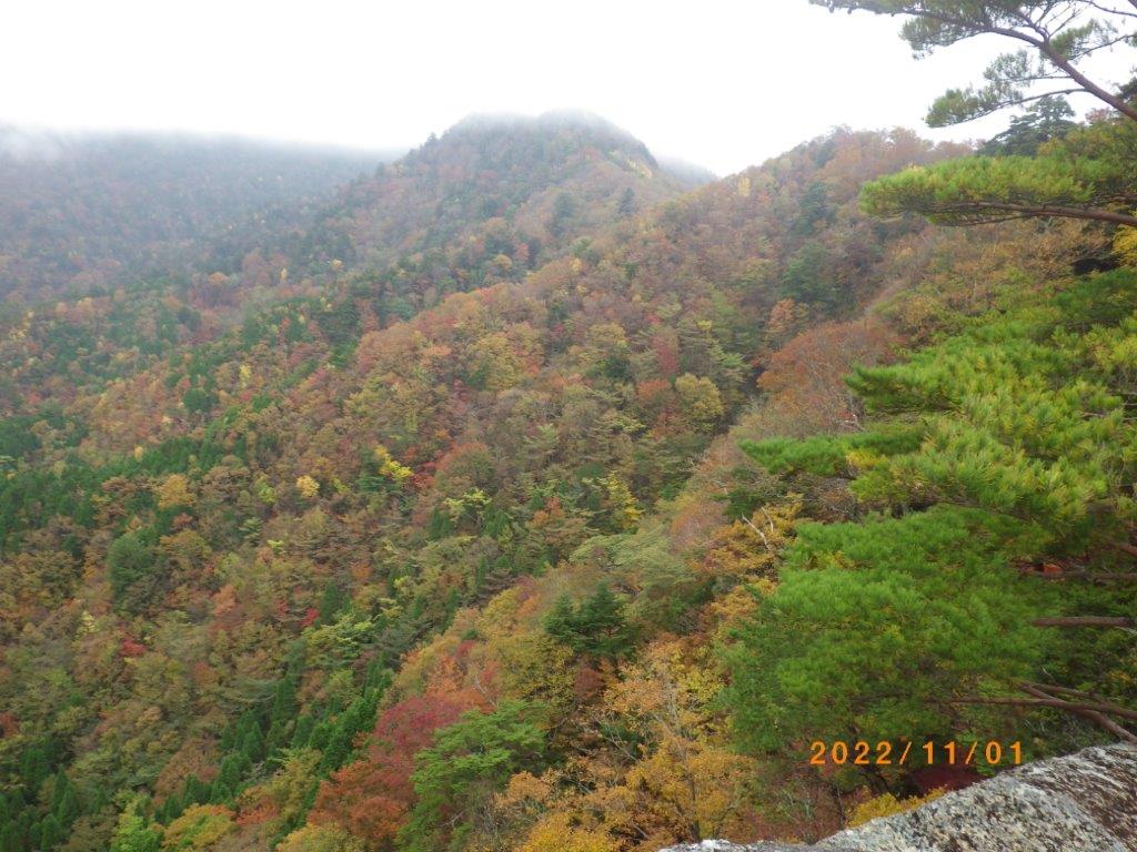 | (11) 神掛岩 | (12) ガスが晴れたタイミングで大障子岩方面の紅葉(クリックで拡大) | ||