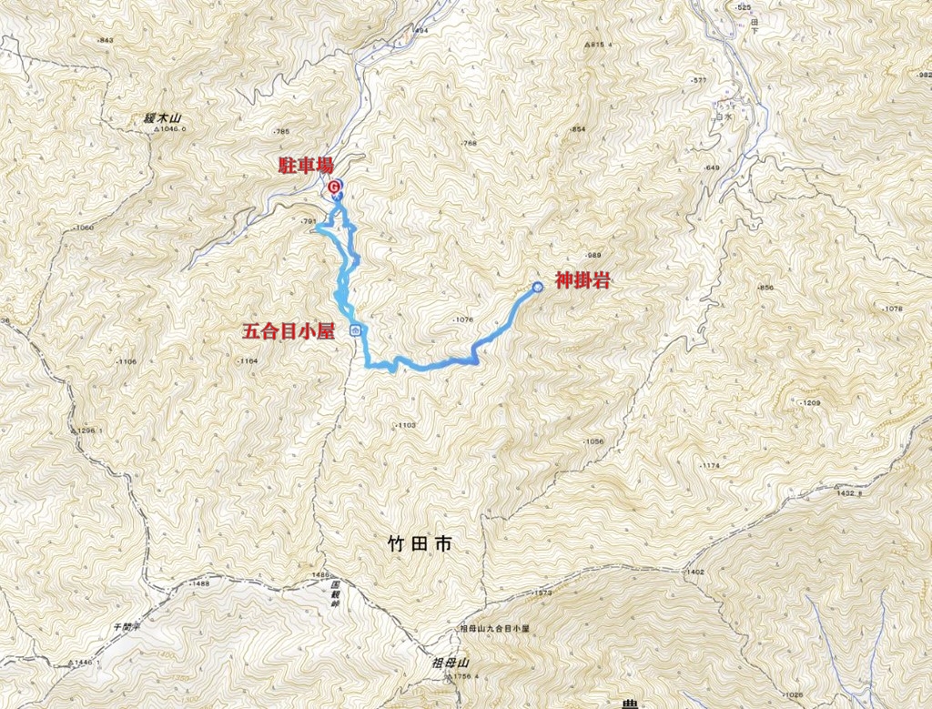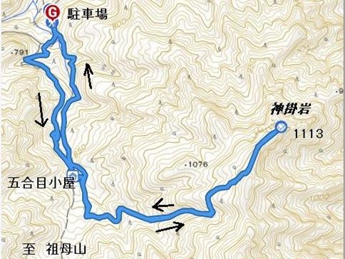 | 神原駐車場673m⇔5合目小屋860m(1.15Km)⇔神掛岩1123m(3.05Km) | |||||||||
