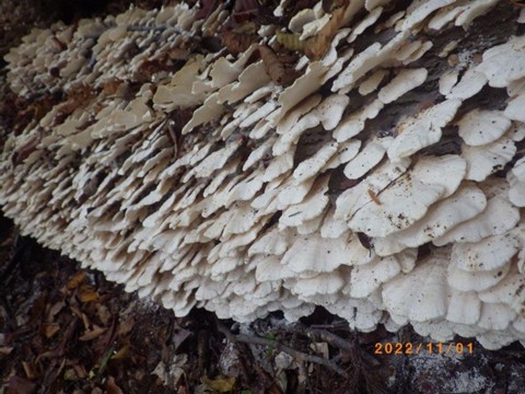 | (3) 倒木に白いキノコが群生していました | (4) 綺麗な紅葉です(クリックで拡大) | ||