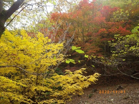 | (5) 綺麗な紅葉を見ながら登っています | (6) 黄色と赤の対比が綺麗 | ||