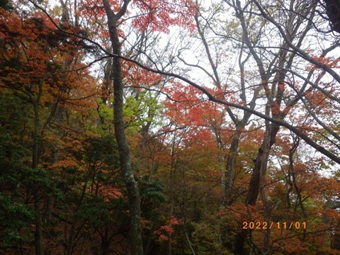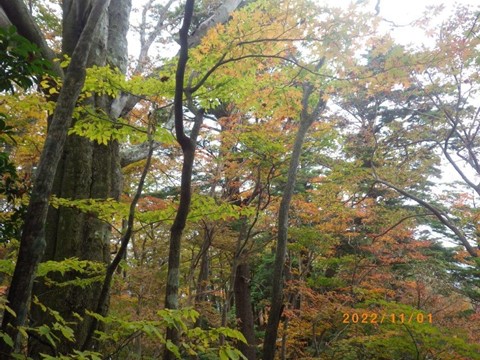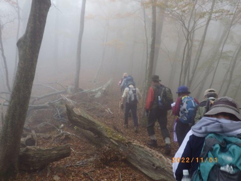 | 当初東山ハイキングコースの予定でしたが、先日の台風でコース内の丸木橋が流出し、通行不可の情報が入り急遽「小鹿山」に変更しました。登山道は整備されており歩きやすいですが、最後の急坂は皆汗をかきながら登りました。山頂はガスがかかり残念ながら展望は得られませんでした。秋の訪れを感じながらの楽しい山歩きとなりました。 |