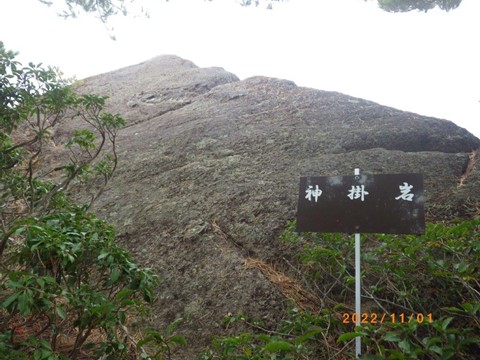 | 神原登山口から神原川沿いに左岸歩き、5合目小屋から左折し巨岩の「神掛岩」 | |||||||||