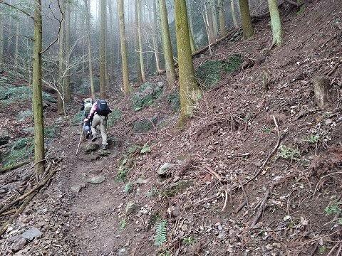 | (5) 8合目の分岐左へ進みます。山庵寺は帰路寄ります。 | (6) (5)の右奥に写っている、壊れた鳥居です。 | |