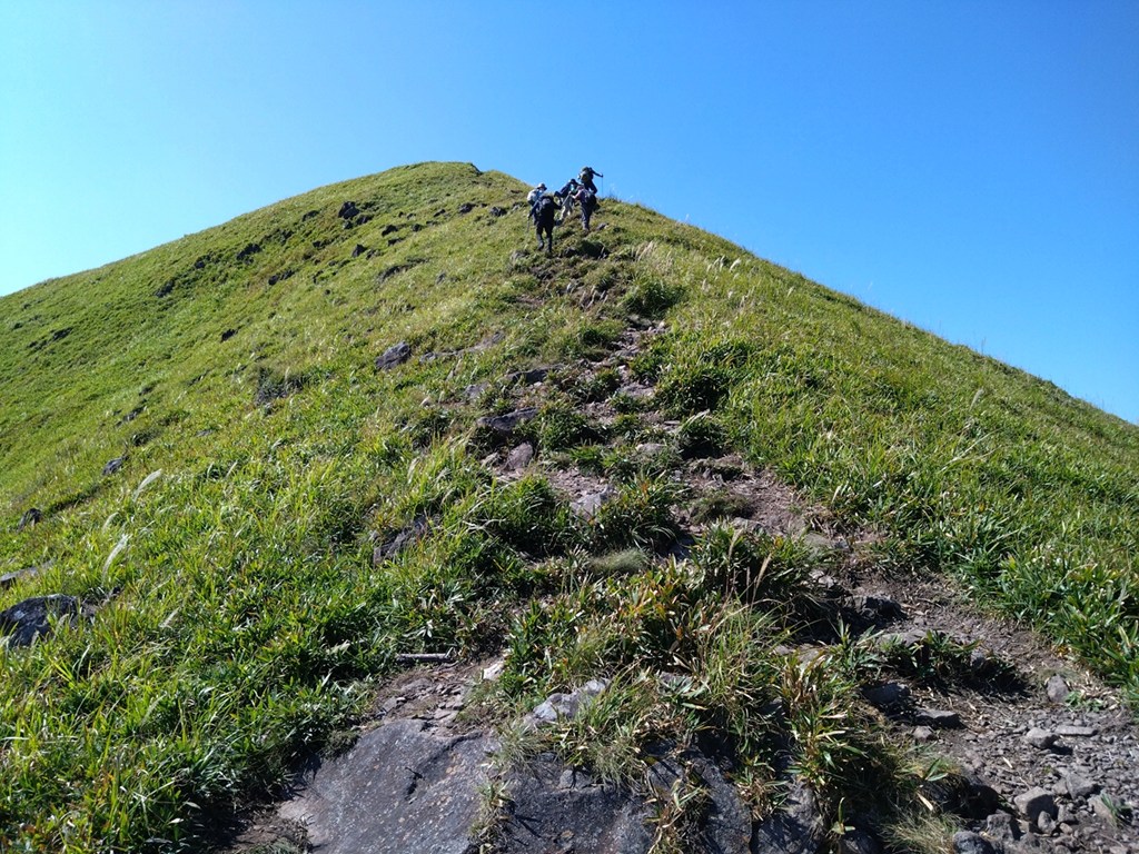 林間で日陰なのが救いである。坂が緩やかになり、林を抜ける。ここからは草原を進む。 |