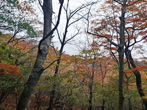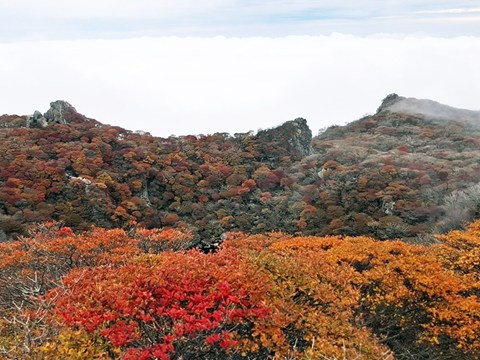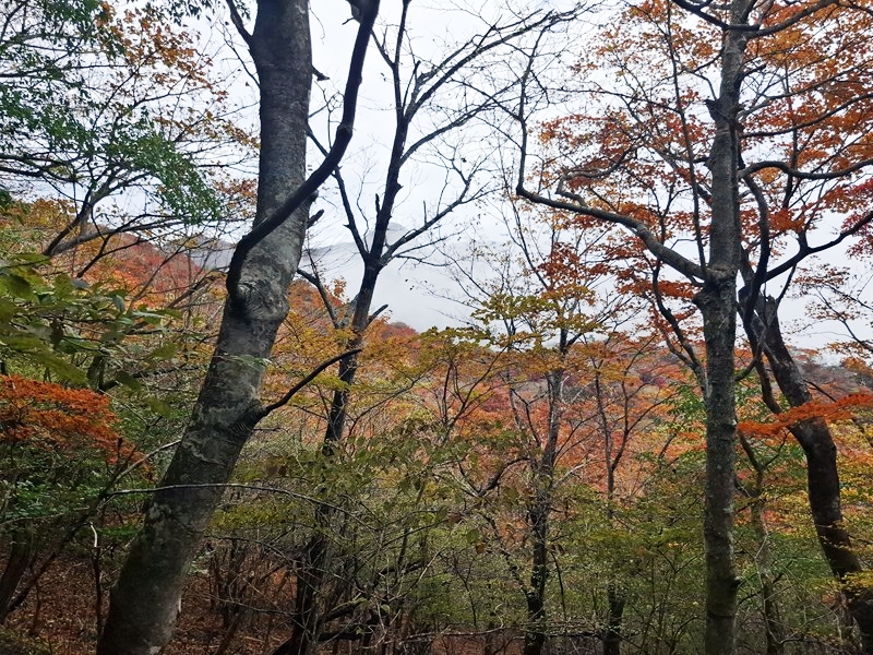 昼食を食べてる間にガスが晴れて、素晴らしい紅葉を楽しむ事が出来ました。 |