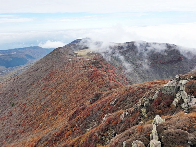 ・ 大船山へ紅葉観賞登山をしました。頂上到着時はガスで眺望が良くなかったのですが、 |
