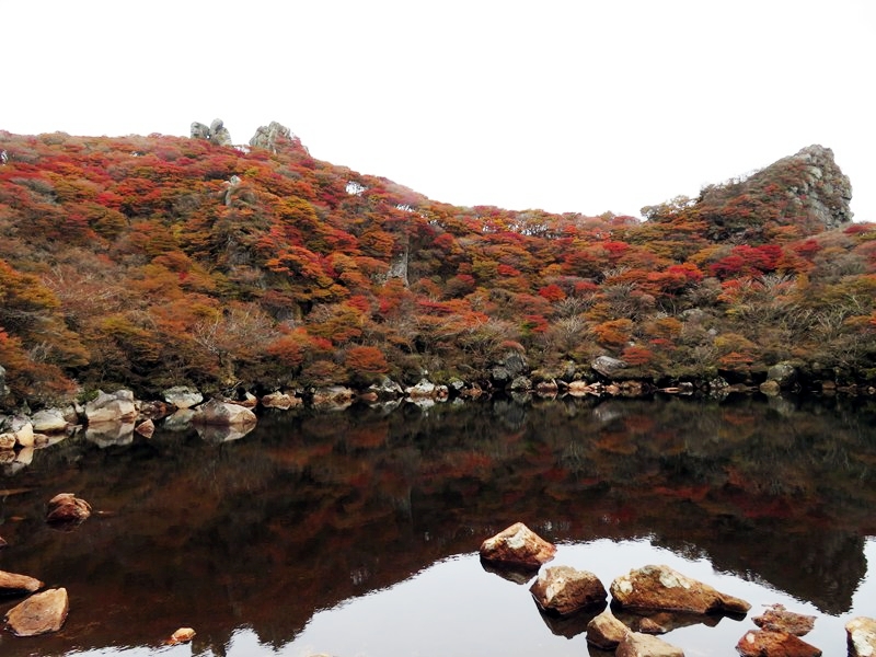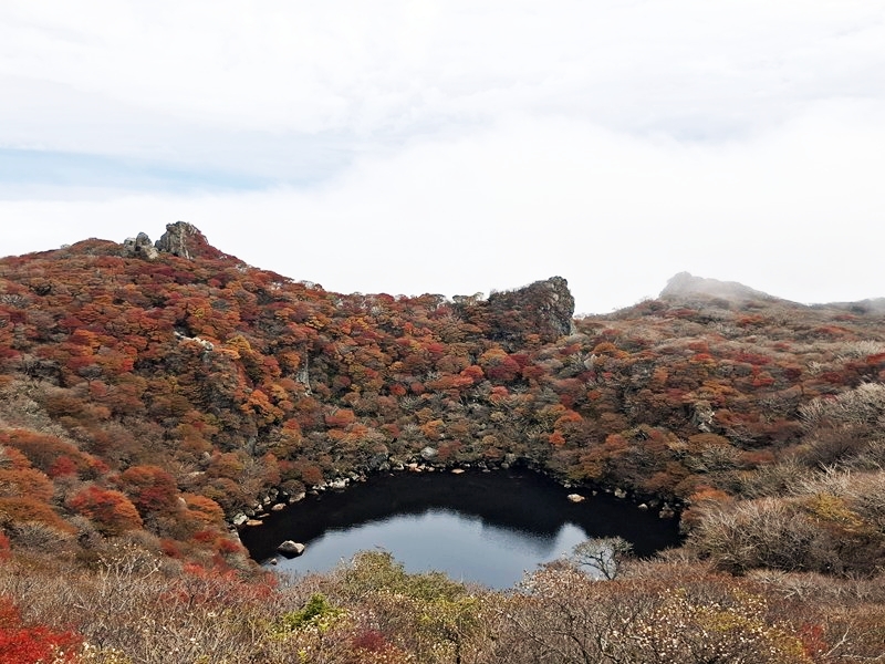昼食・休憩後、御池に下りて火口湖周辺の紅葉も楽しみました。