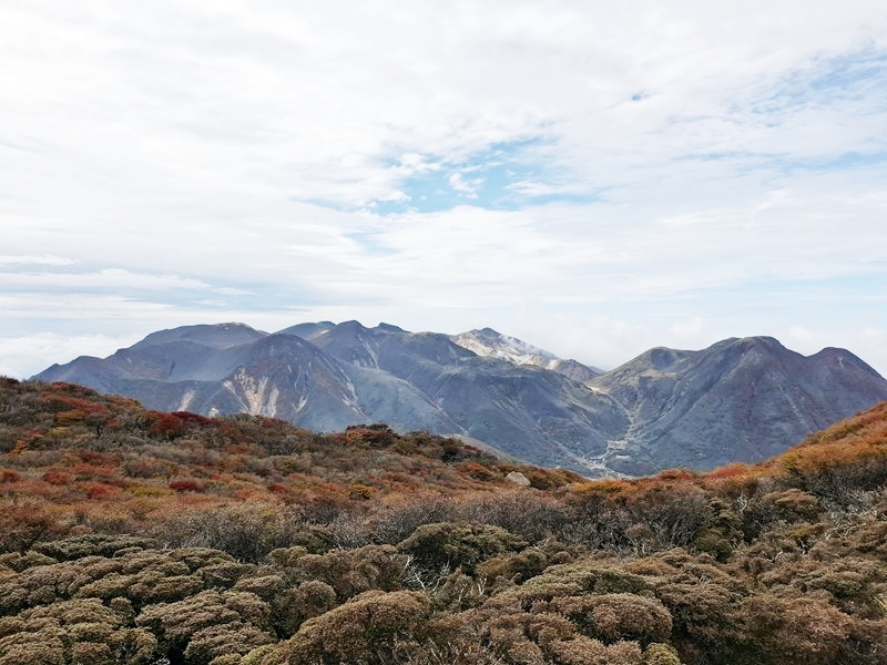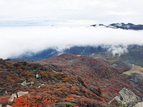 ・ 大船山へ紅葉観賞登山をしました。頂上到着時はガスで眺望が良くなかったのですが、