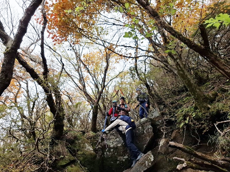 下山中、段差の大きい難所を通過中 下山時に鳥居窪から大船山の紅葉